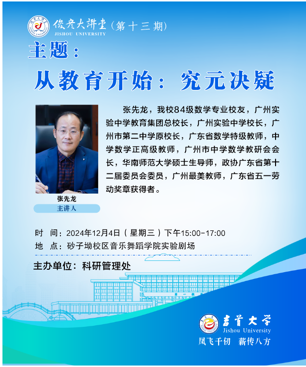 张先龙,我校84级数学专业校友,广州实验中学教育集团总校长,广州实验中学校长,广州市第二中学原校长,广东省数学特级教师,中学数学正高级教师,广州市中学数学教研会会长,华南师范大学硕士生导师,政协广东省第十二届委员会委员,广州最美教师,广东省五一劳动奖章获得者。