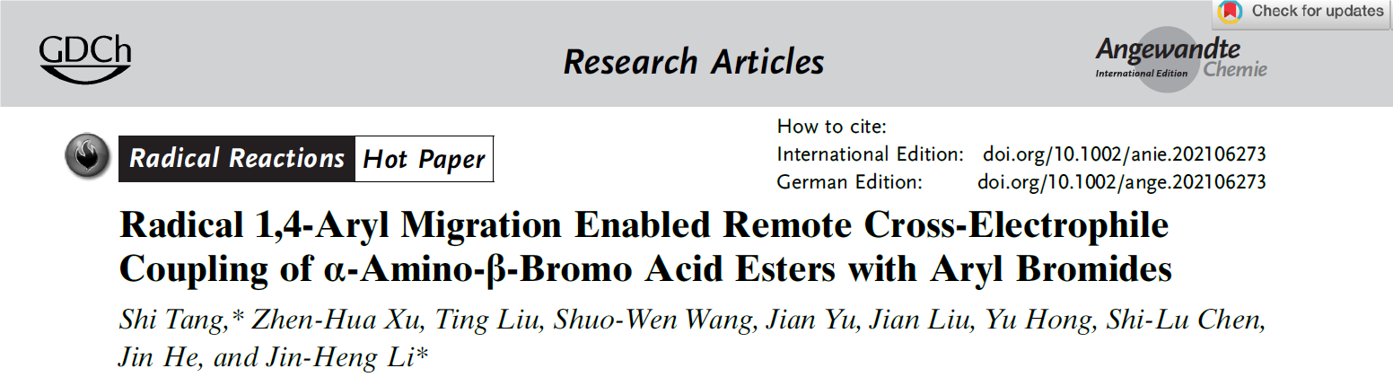 近日,我校化学化工学院唐石教授团队在Smiles重排反应(又称微笑反应)应用于氨基酸分子精准合成研究领域取得重要进展,相关成果以“Radical 1,4-Aryl Migration Enabled Remote Cross-Electrophile Coupling ofa-Amino-β-Bromo Acid Esters with Aryl Bromides”为题发表在国际顶级期刊Angewandte Chemie《德国应用化学》,william威廉亚洲(中国)有限公司为第一完成单位,论文被杂志选为热点文章(Hot Paper)。《德国应用化学》创刊于1887年,作为国际化学领域的顶级期刊在业界具有极大的影响力,最新影响因子为15.336。