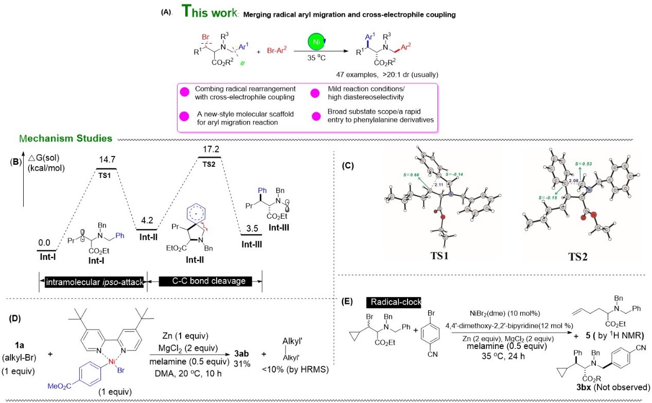 基于上述背景,唐石教授团队与南昌航空大学李金恒教授,以及北京理工大学陈世稆教授(化学计算)合作,创造性地设计了一类芳基迁移分子骨架前体——N-苄基-β-溴氨基酸酯,发展了一种新颖的镍催化的以C(sp3)-碳中心自由基为纽带串联Smiles重排/还原交叉偶联反应,这是首例Smiles重排与还原交叉偶联串联反应报道。该反应为构建具有良好立体选择性的β-芳基化并带有不对称叔胺结构单元的氨基酸酯类化合物提供了一种简便、高效的方法(图a)。作者通过一系列控制实验研究,证实了反应经历了自由基的历程(图b-e)。同时还通过密度泛函理论(DFT)计算以及镍物种[Ar-Ni(L)-Br]的设计合成及运用,以及反应副产物的监测与捕捉,也为催化循环的偶联机制提供了有力证据。