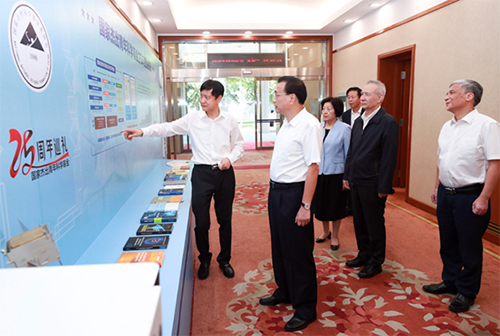会前,在通往国务院第一会议室的走廊上,李克强和国务院其他几位领导参观了国家杰出青年科学基金25周年巡礼展。