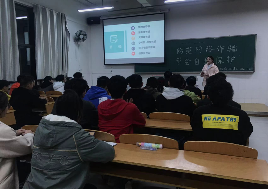 11月28日晚,发规科技社科党支部与2020级临床医学二班全体同学在大田湾校区第二教学楼开展“我为群众办实事”实践活动,活动的主题为“防范网络诈骗 学会自我保护”。党支部书记汤自军老师、袁佳敏老师与2020级临床医学二班全体同学共同参与活动,活动邀请了学校“典”亮湘西法律志愿服务团成员2019级法学二班周叶琳同学进行宣讲。