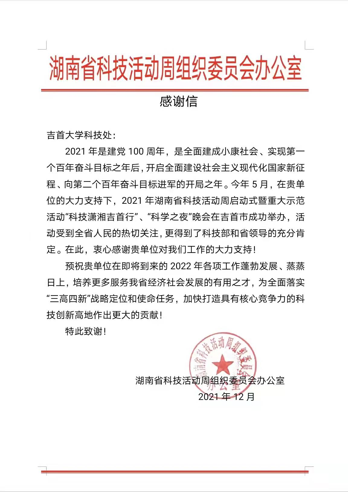 2021年湖南省科技活动周启动式暨重大示范活动“科技潇湘吉首行”、“科学之夜”晚会在吉首市成功举办,受到全省人民的热切关注,更得到了科技部和省领导的充分肯定。近日,湖南省科技活动周组委会办公室(湖南省科技厅)向我校写来了感谢信,对我校的大力支持与积极参与表示了高度地肯定与赞扬。