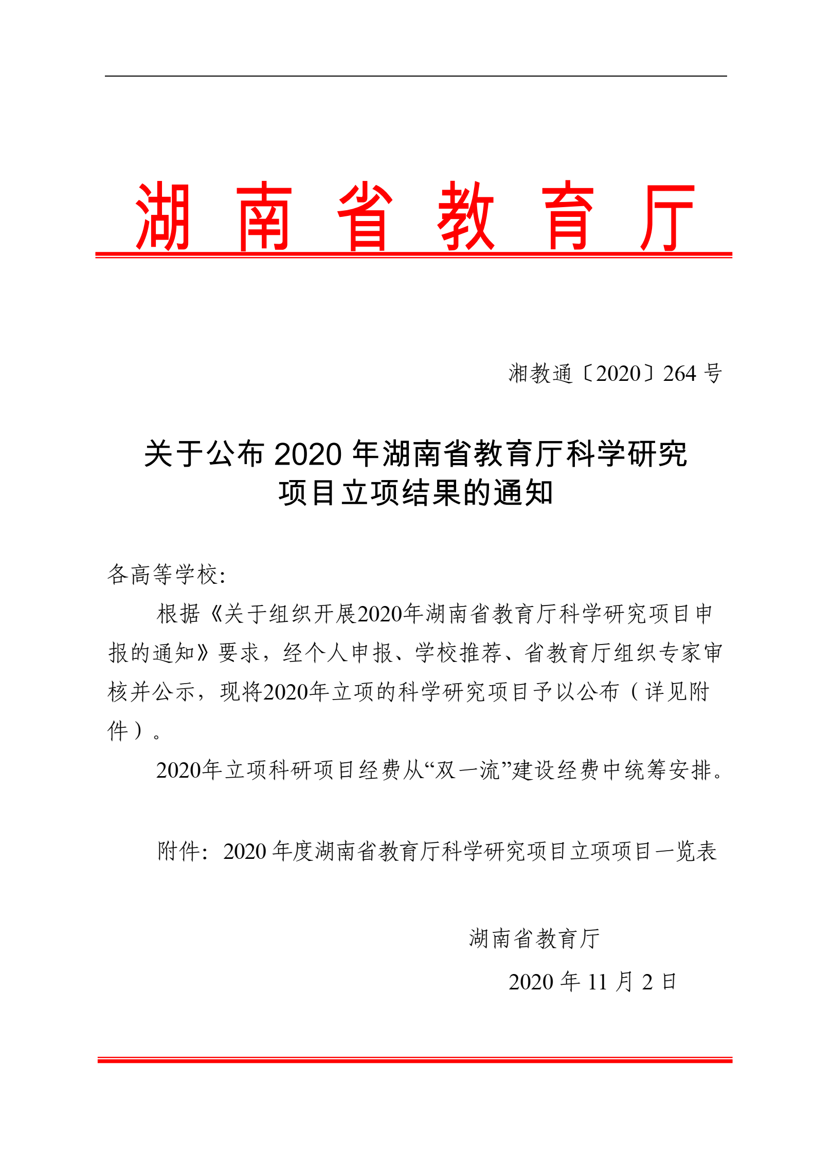 关于公布2020年湖南省教育厅科学研究项目立项结果的通知(william威廉亚洲(中国)有限公司)